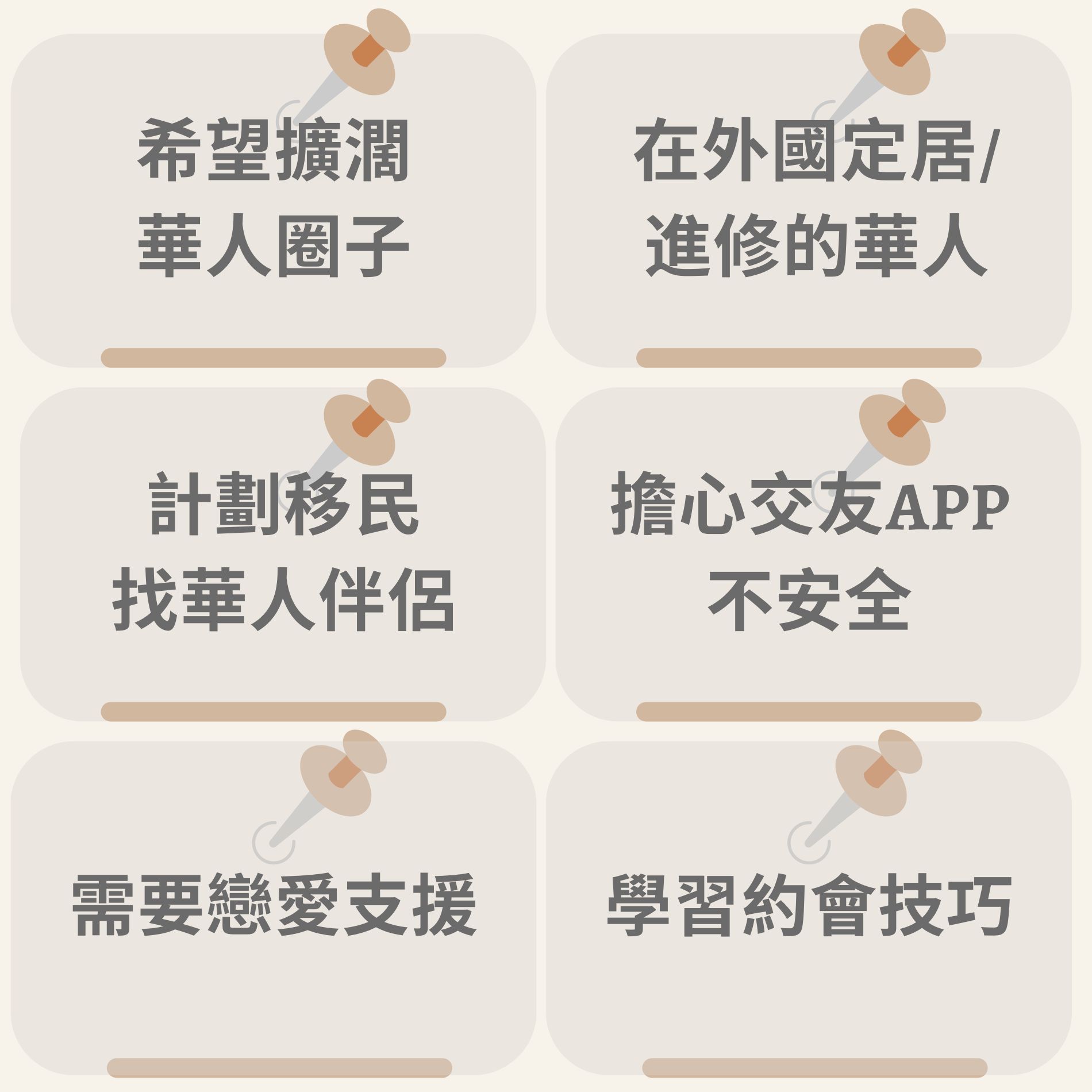 為海外華人(華僑/華裔)提供安全隱私的交友平台,幫助您遇到理想的伴侶或結婚對象,跨地域限制,並給您專業支援。讓您輕鬆認識有近似價值觀的人。
