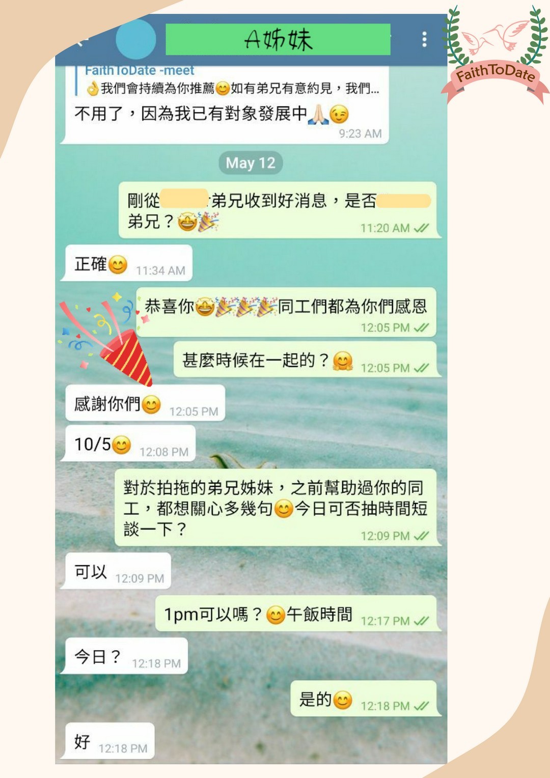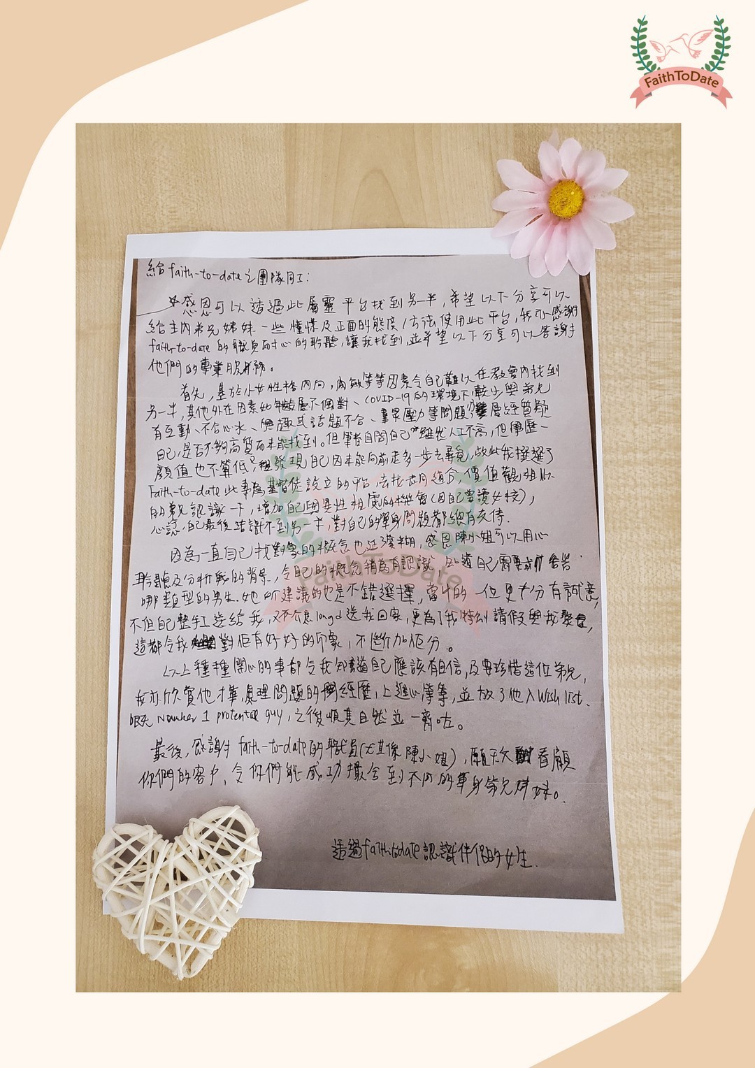 最後,感謝faith-to-date的職員(尤其係陳小姐),願天父看顧你們的客戶,令你們能成功撮合到不同的單身弟兄姊妹。