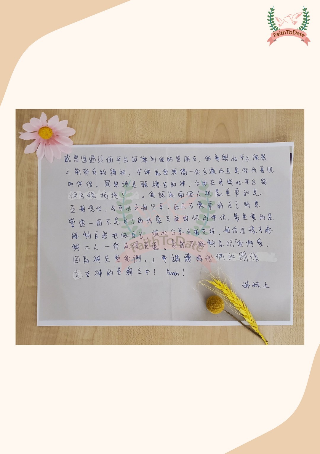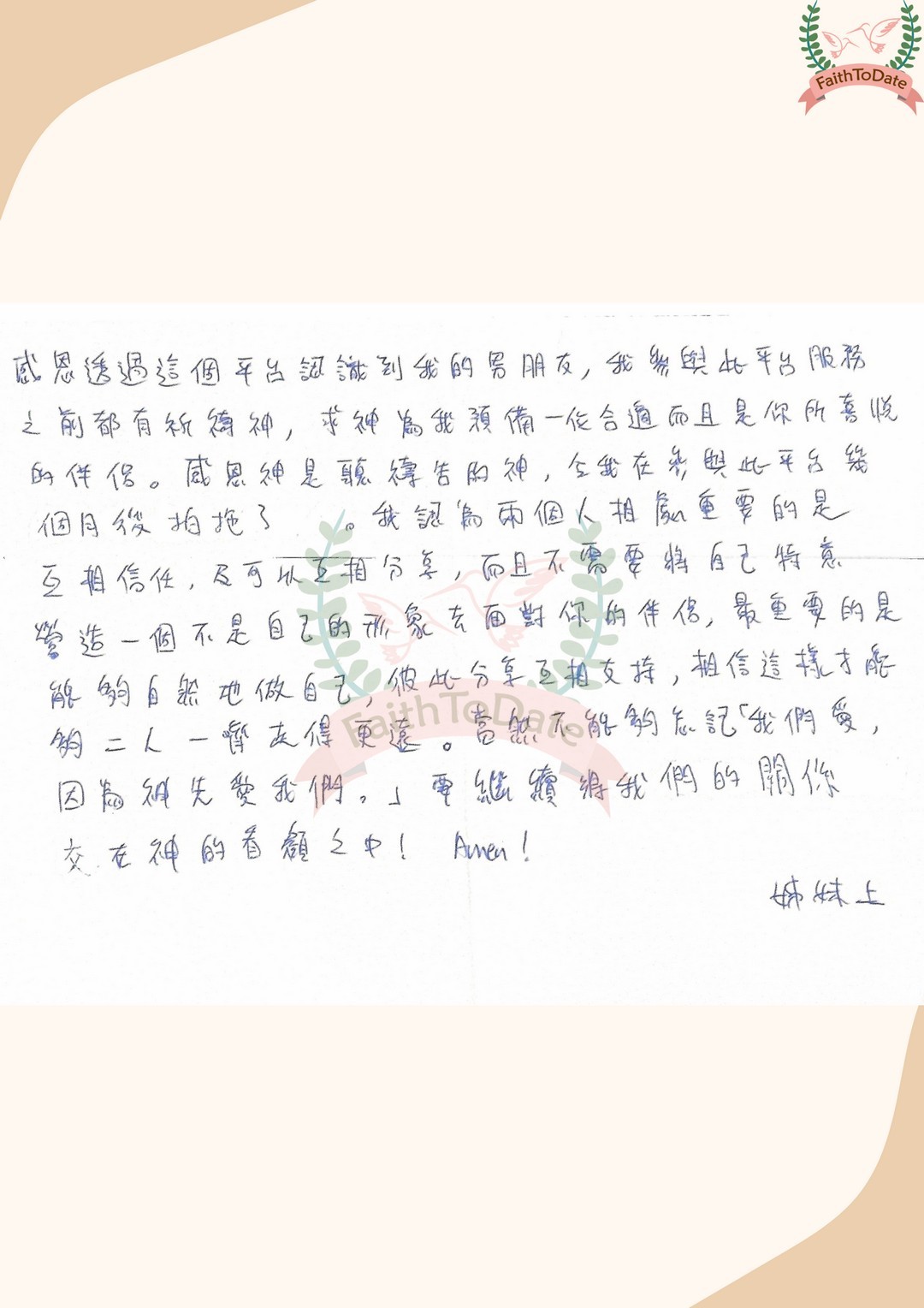 感恩神是聽禱告的神,令我在參與此平台幾個月後拍拖了。我認為兩個人相處重要的是互相信任,及可以互相分享,而不需要將自己特意營造一個不是自己的形象去面對你的伴侶,最重要的是能夠自然地做自己,彼此分享互相支持,相信這樣才能夠二人一齊走得更遠。當然不能夠忘記「我們愛,因為神先愛我們。」要繼續將我們的關係交在神的看顧之中!Amen!