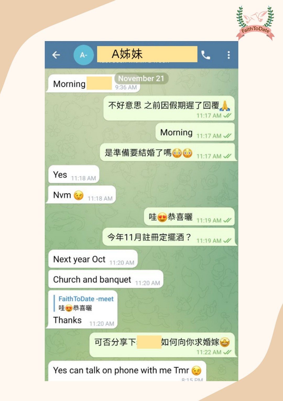" 我們下年十月擺酒了" (church and banquet)"