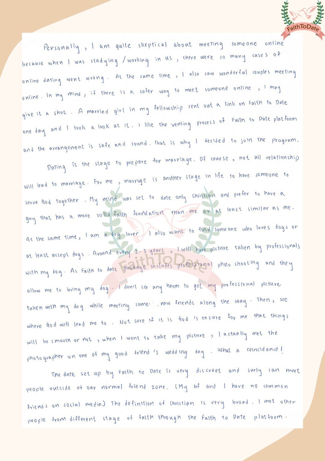 Personally, I am quite skeptical about meeting someone online because when I was studying/working in US, there were so many cases of online dating went wrong. At the same time, I also saw wonderful couples meeting online. In my mind, if there is a safer way to meet someone online, I may give it a shot. A married girl in my fellowship sent out a link on Faith to Date one day and I took a look at it. I like the venting process of Faith to Date platform and the arrangement is safe and sound. That is why I decided to join the program.