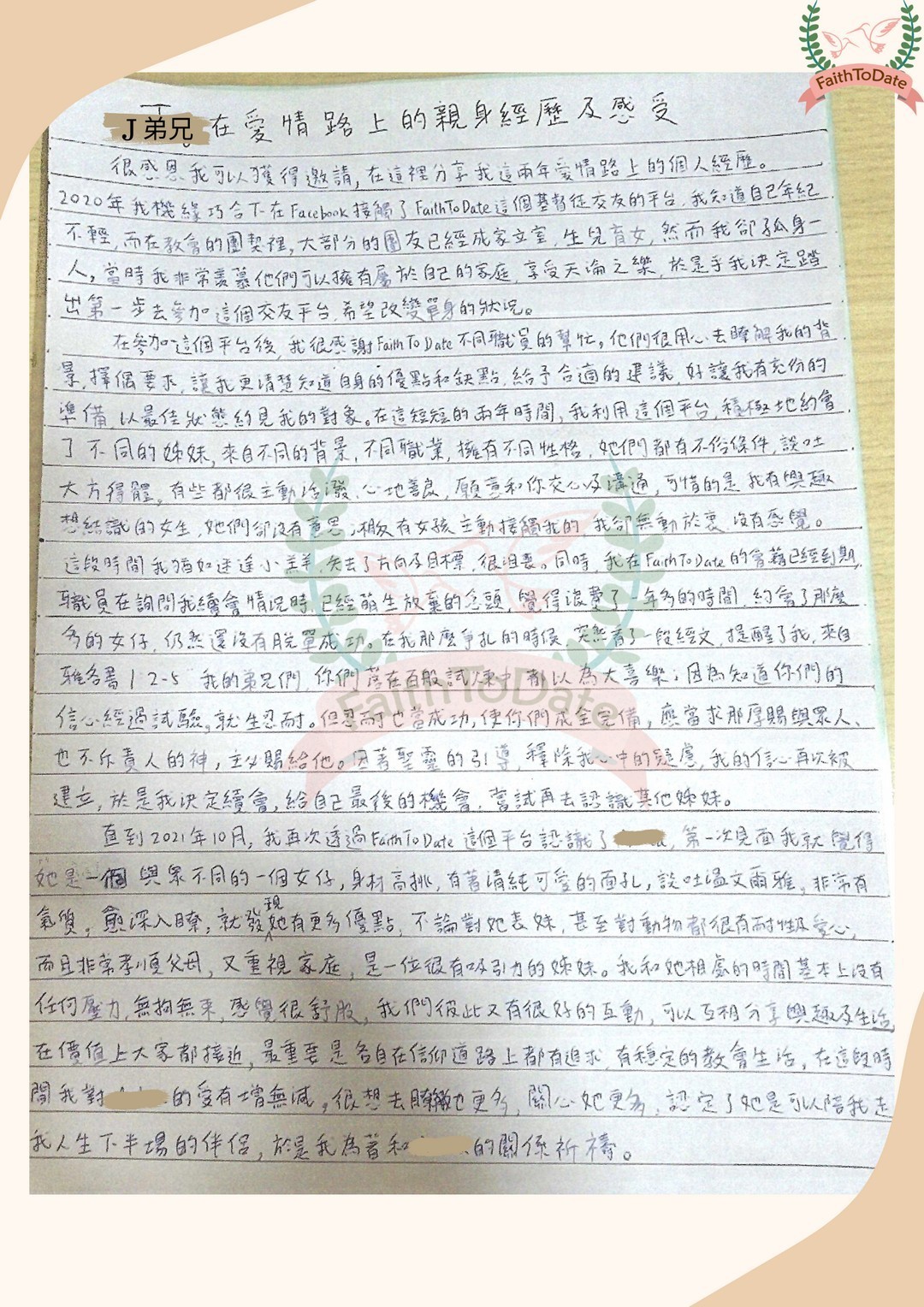 I hesitated as a lost little lamb, lost my direction and goals, and was very frustrated. At the same time, my membership in FaithToDate has expired. When the staff asked me about my renewal status, I had already begun to give up. I felt that I had wasted more than a year, dated so many girls, and still had not successfully left single status. When I was struggling so much, I suddenly read a passage of Scripture that reminded me, from James 1:2-5 “Consider it pure joy, my brothers and sisters,whenever you face trials of many kinds, because you know that the testing of your faith produces perseverance. Let perseverance finish its work so that you may be mature and complete, not lacking anything. If any of you lacks wisdom, you should ask God, who gives generously to all without finding fault, and it will be given to you.” ......
