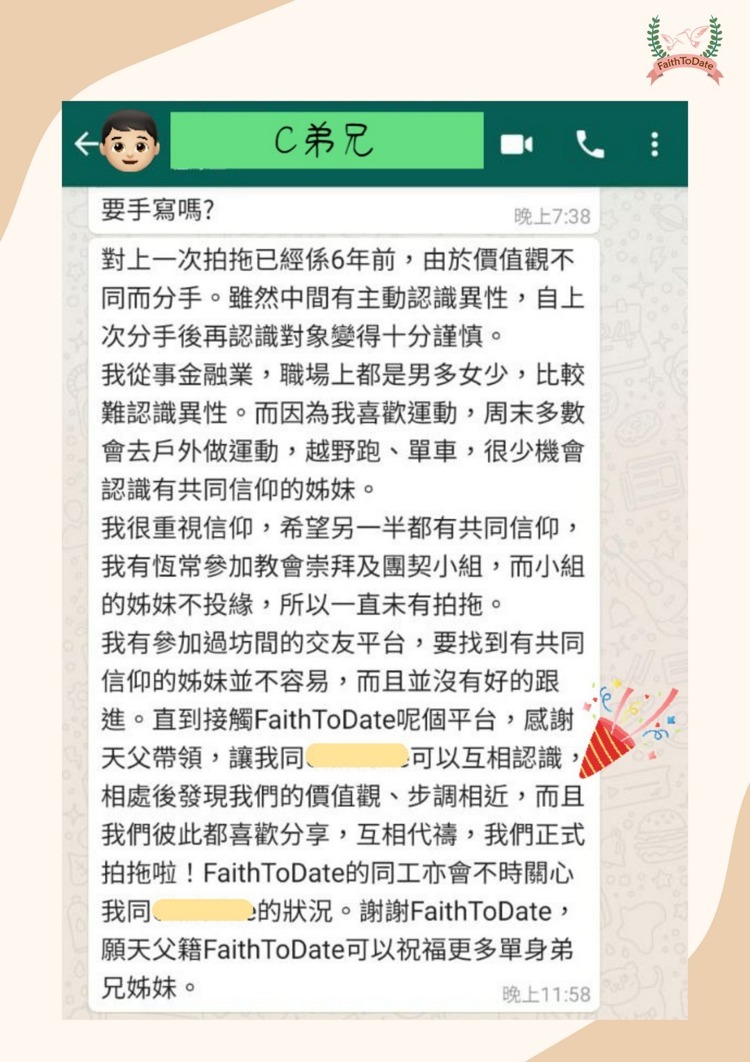 我有參加過坊間的交友平台,要找到有共同信仰的姊妹並不容易,而且並沒有好的跟進。直到接觸FaithToDate呢個平台,感謝天父帶領,讓我同C可以互相認識,相處後發現我們的價值觀、步調相近,而且我們彼此都喜歡分享,互相代禱,我們正式拍拖啦!