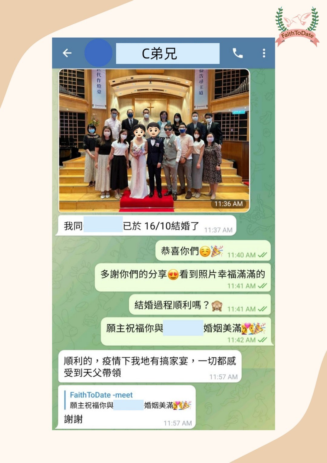 Faith Faith: Congratulations Brother C, hoping you have a happy and beautiful family, overflowing with the Lord’s grace. < Original Text > C弟兄(whatsapp): “我同C…已於10月結婚了” “順利的,疫情下我地有搞家宴,一切都感受到天父帶領” (All glory to the Lord)