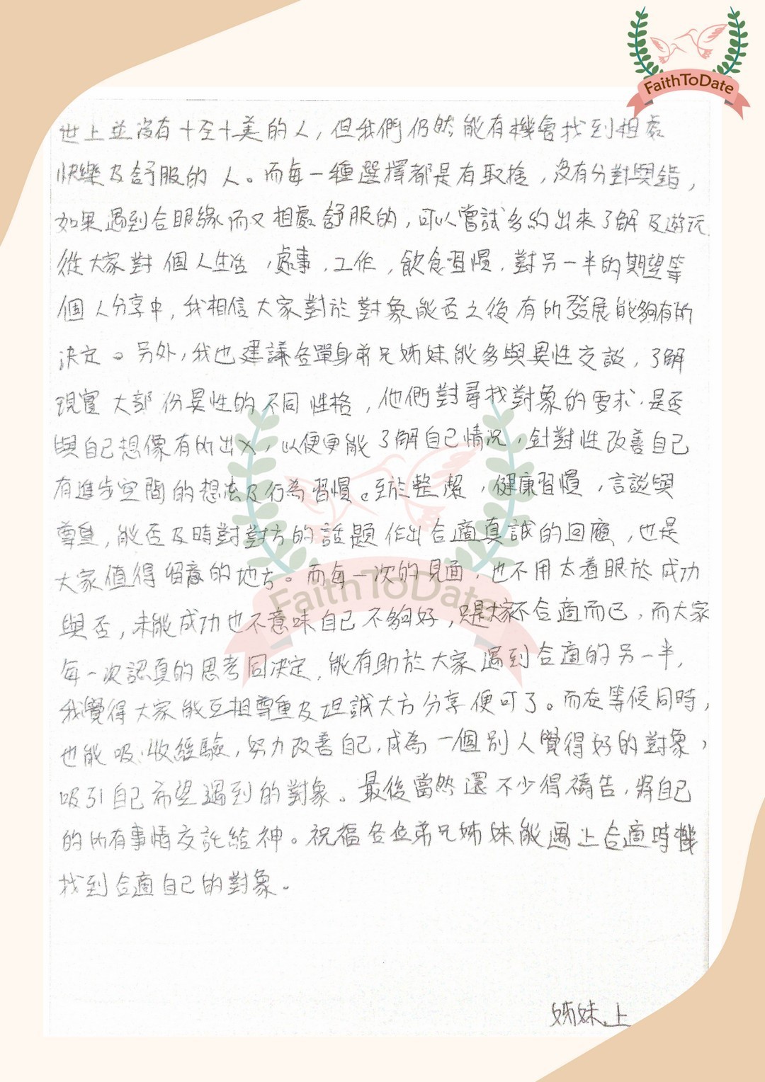 在2021年期間,我一直忙於工作及進修。間中有時間也有參加一些朋友邀請的活動,可是在活動期間主要都是與一些比較熟的朋友玩樂,很少會主動與朋友圈外的人交流,而且參加活動的圈子無論在年紀、職業、宗教、興趣、習慣各方面都比較廣闊及很多人的背景都不能即時有所了解。在只有單次參與及與其他人甚少有交流情況下,這樣來來回回很難認識理想對象。有時候可以能碰上有主動聯絡,可是又發現對方不合眼緣及有些壞習慣如吸煙等等。而為了節省時間,也曾從一些免費交友軟件上認識其他人,可是很多時候那些人填寫的資料未必真實及真人與圖片差異太多。另外,屬於基督教而又認真認識對象,而自己合眼緣同時又能溝通愉快的真是廖廖可數,一年又一年的過去,還是沒有認識到自己希望認識的人。於是,最後我決定針對性尋找了一些基督教背景的配對服務作出嘗試,機構同工與我傾談,並針對性就我的要求選出合適的對象,並就我的情況,對我的要求作出一些建議,以擴闊尋找的對象。在短短一個月內,很感恩同工很快已為我作配對與對象見面。在此,很感謝同工們快速的效率及背後付出的努力。