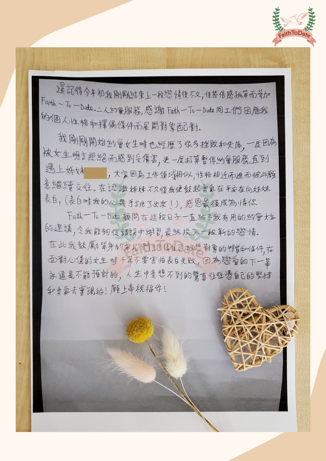 感謝FaithToDate 同工們因應我的個人性格和擇偶條件而展開對象配對。