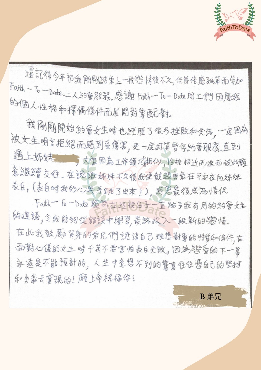 感謝FaithToDate 同工們因應我的個人性格和擇偶條件而展開對象配對。