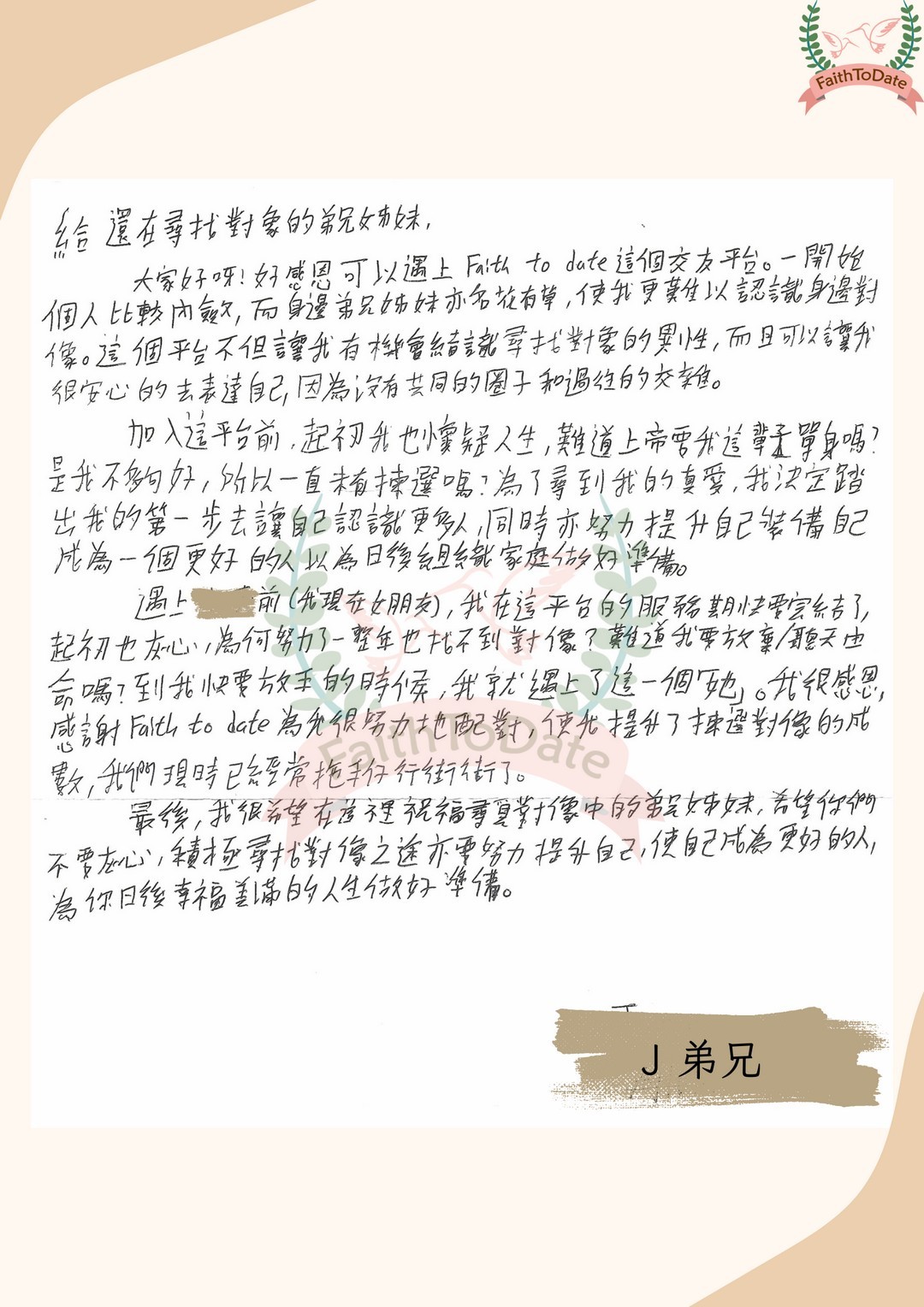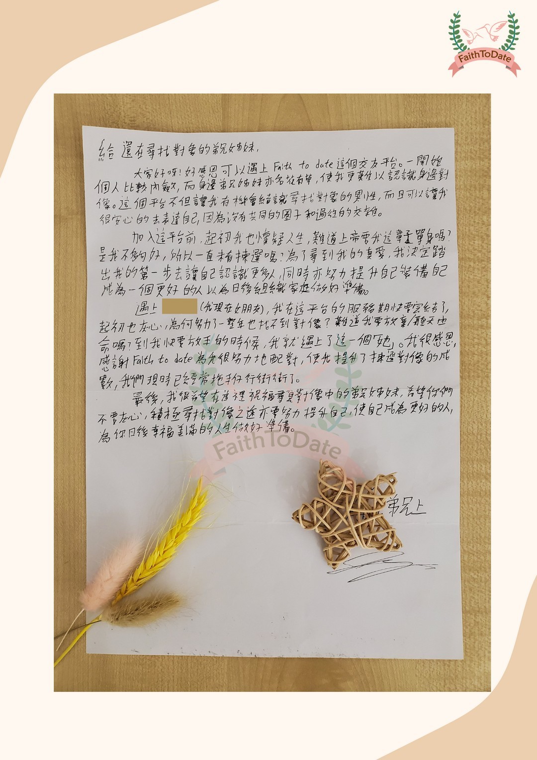 大家好呀!好感恩可以遇上Faith to date這個交友平台。一開始個人比較內斂,而身邊弟兄姊妹亦名花有草,使我更難以認識身邊對像。這個平台不但讓我有機會結識尋找對象的異性,而且可以讓我很安心的去表達自己,因為沒有共同的圈子和過往的交雜。