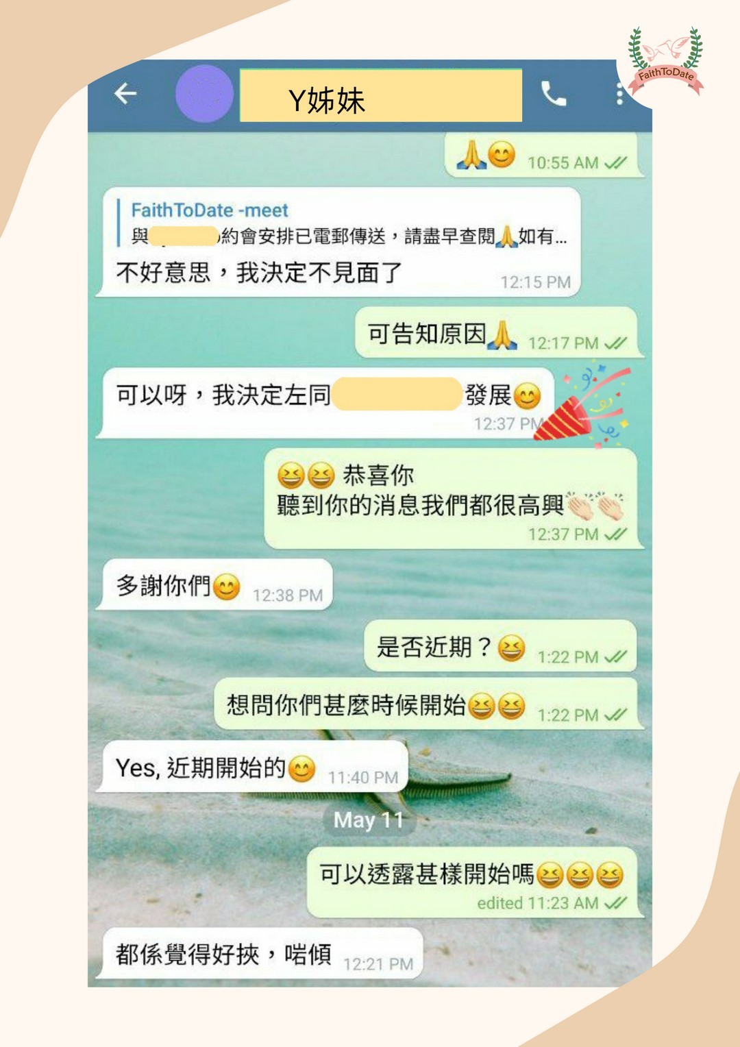 30歲的Kam姊妹是一名教師,在特殊學校任教,以照顧自閉學童為主,而憑藉在鋼琴方面的八級造詣,她有負責教授音樂,公餘時也有在教會中出任司琴。生活圈子中以女性為主,加上工作忙碌,而且個性內向和慢熱,讓她鮮有結識異性的機會。她有試用過坊間一般交友平台,但很快就礙於其私隱度和安全性而卻步。終於,她選中了Faith To Date,可惜,未能一擊即中,跟一、兩個男會員見面後,那個他還沒有出現。